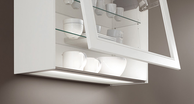 Obložení výklenku je volitelně k dispozici s integrovaným LED osvětlením. LED světelný pásek je vybaven technologií Emotion a zajišťuje jednotné osvětlení pracovního prostoru.